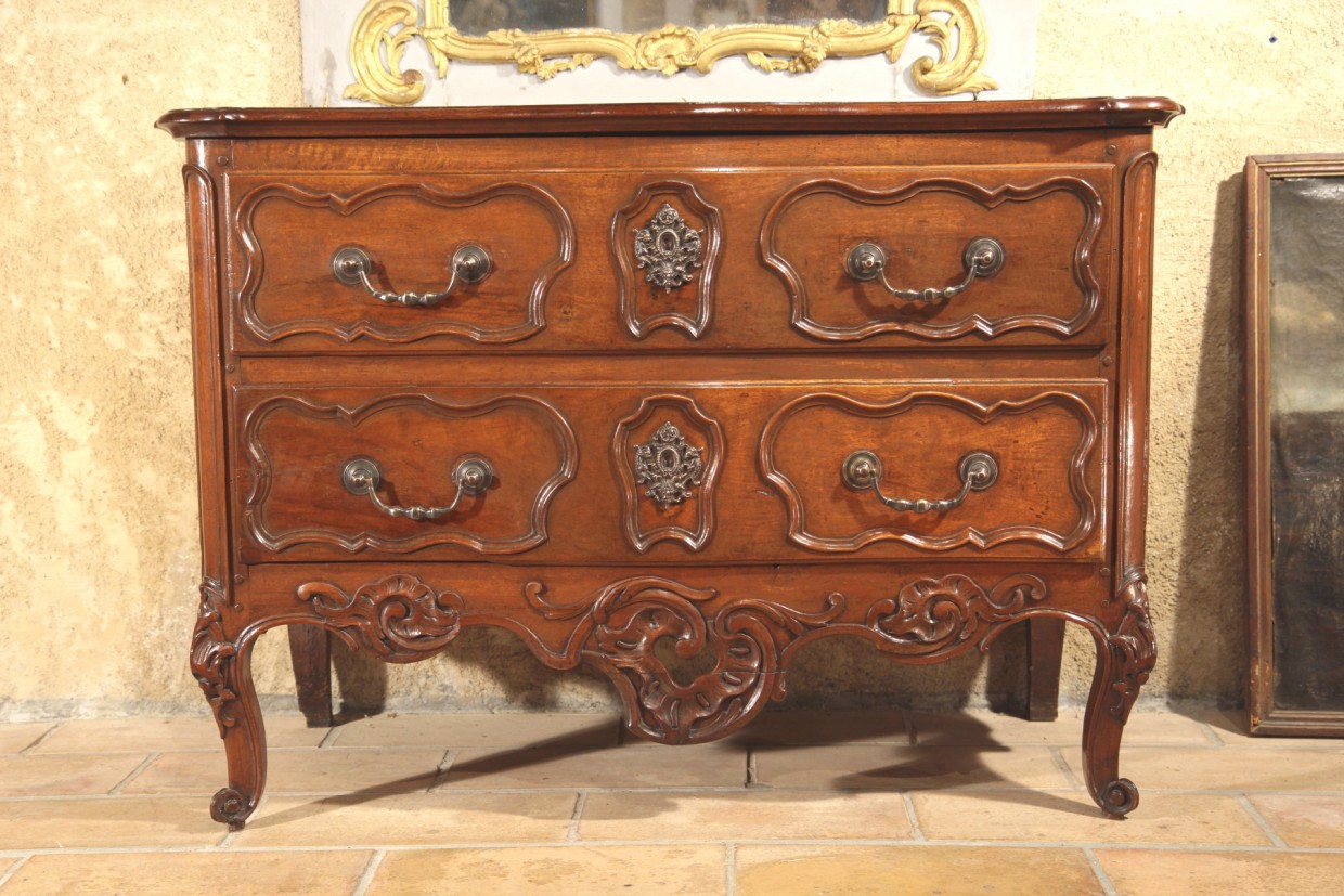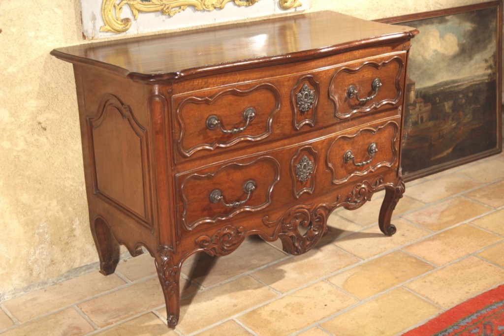 18th C “sauteuse” Commode comprising 2 drawers. Curved front decorated with carved acanthus leaves, cut branches of olive tree and , at the center, a tied ribbon that symbolizes marriage bond. Low apron decorated with a fretwork comprising a soup tureen topped by a pine cone. Based on 4 scroll feet. The top, with double moulding, enlarges on the sides. In walnut wood. From Nîmes (Provence).