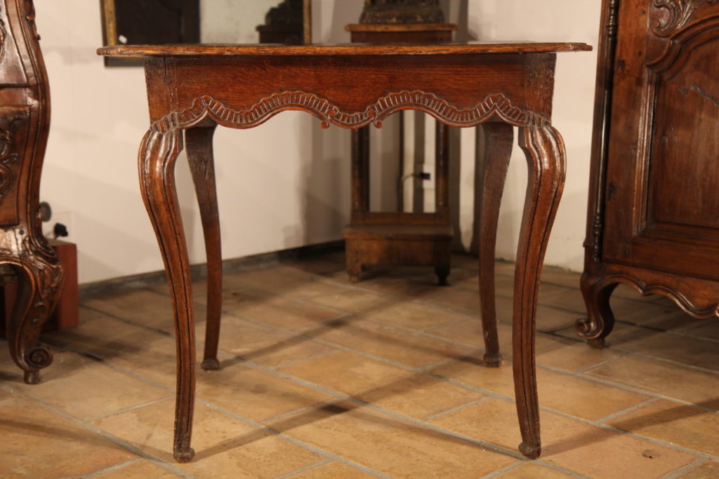 18th C “sauteuse” Commode (chest of drawers) comprising 2 drawers with carved serpentine front. Low apron decorated with a “Rocaille” fretwork . Round uprigths ending in scrolled feet. Sides with moulded panels. In walnut wood. From Nîmes (Provence).