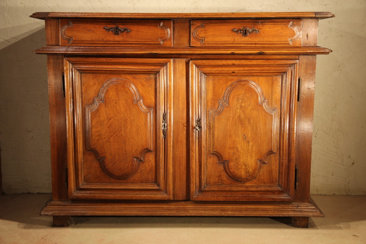 17th C Louis XIV buffet (dresser) comprising 2 doors and 2 drawers. The doors are mounted with frame mouldings and strongly standing out panels; idem for the sides and the fronts of the drawers. In walnut wood. From Provence.