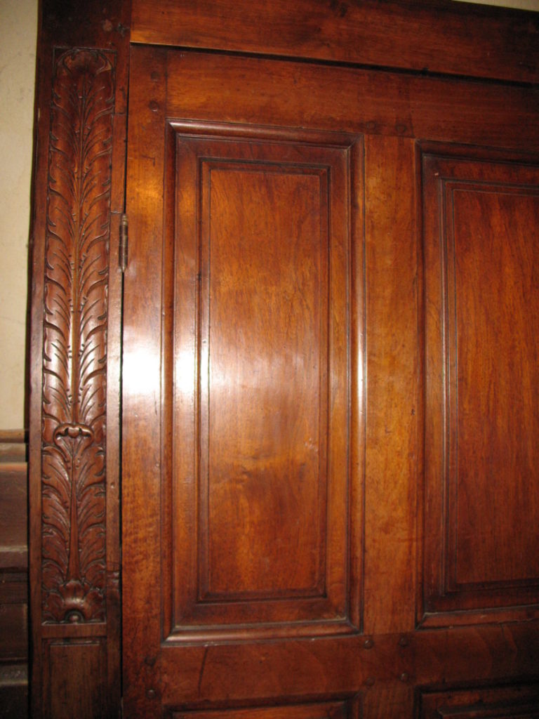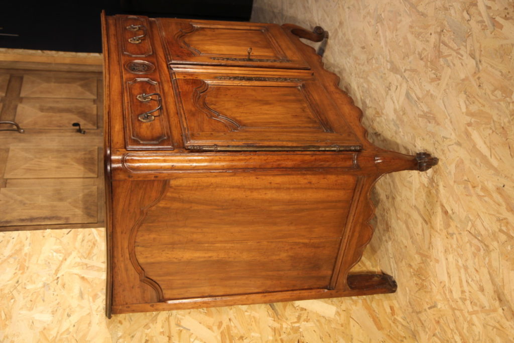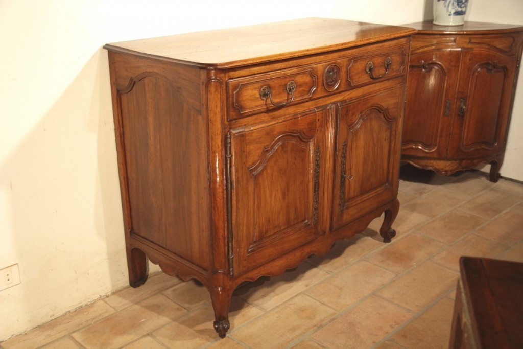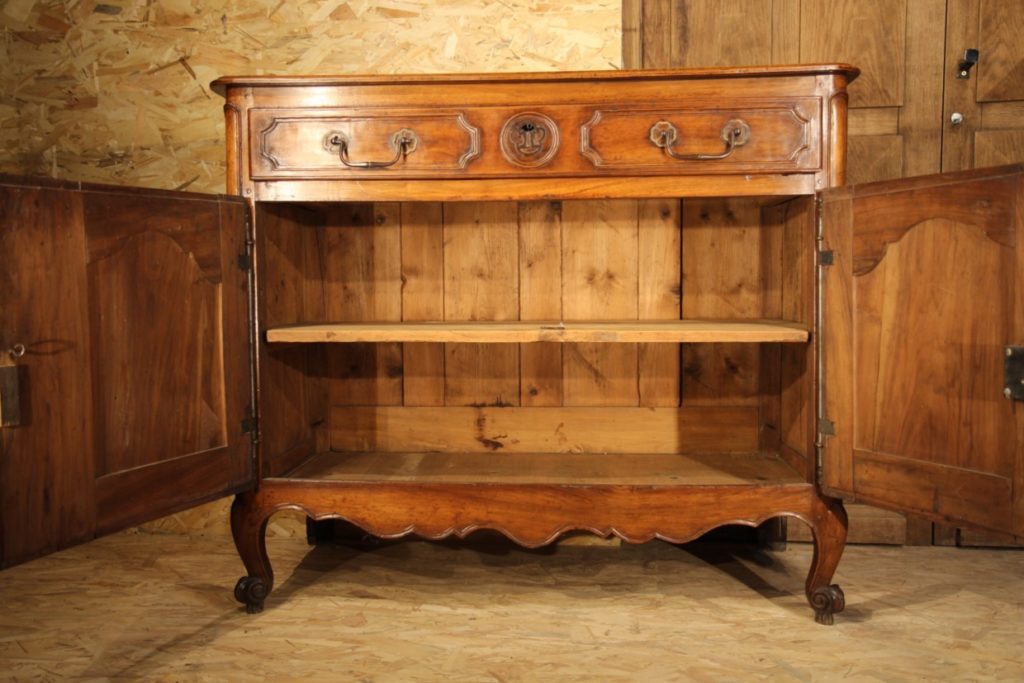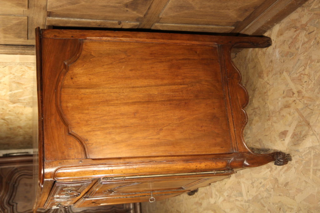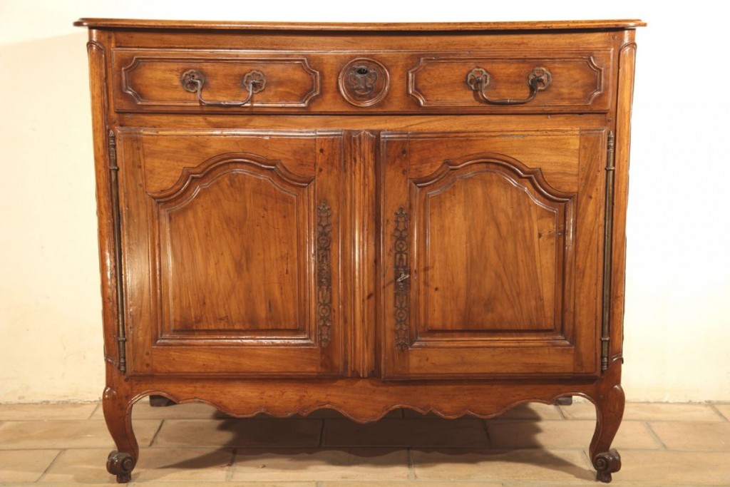 18th C Louis XV buffet (cupboard) comprising 2 doors and a drawer. Round uprigths with prominent mouldings ending in scroll feet. Doors with prominent panels. Drawer decorated with 3 cartouches carved in “elegie”. Chapel sides. In walnut wood. From Provence.