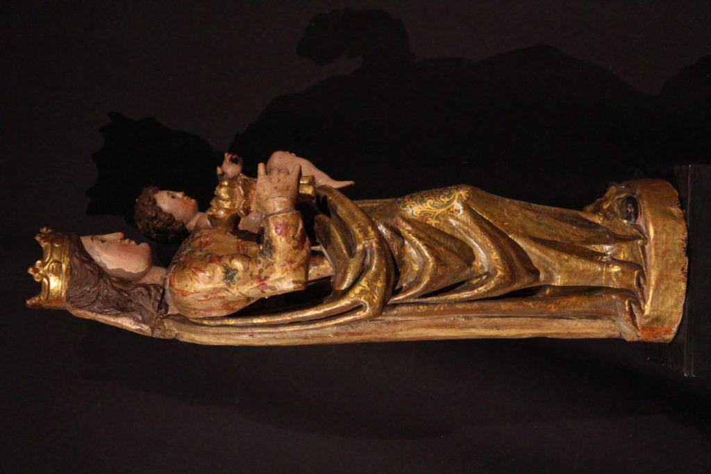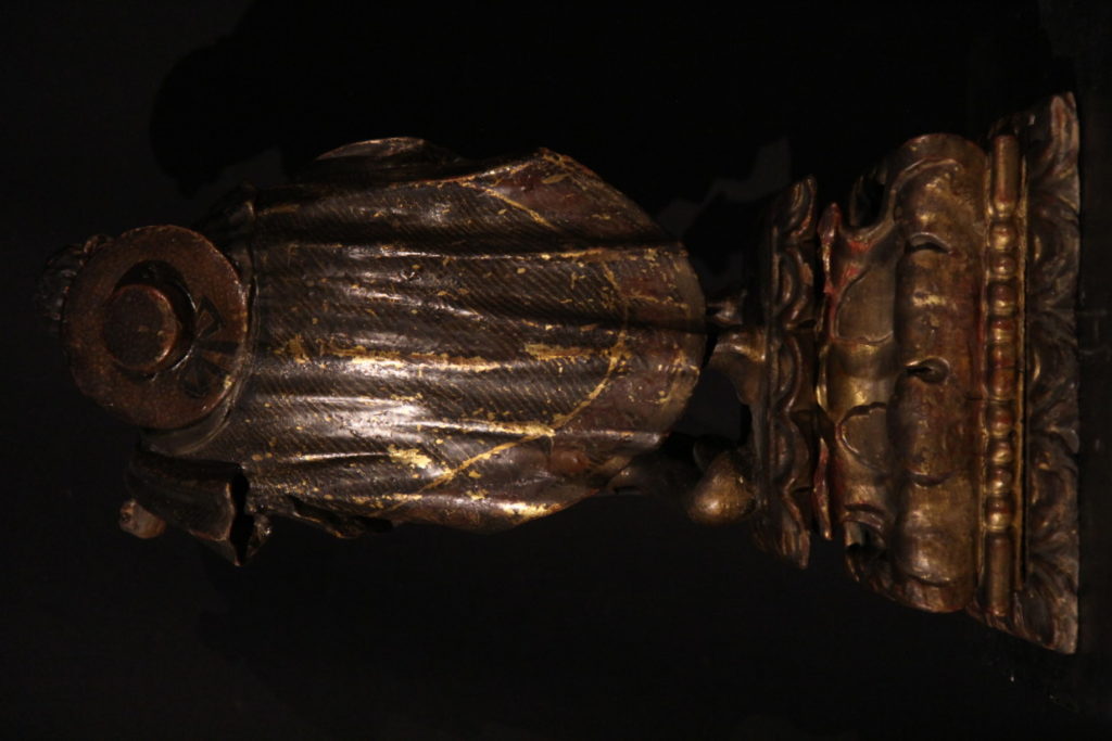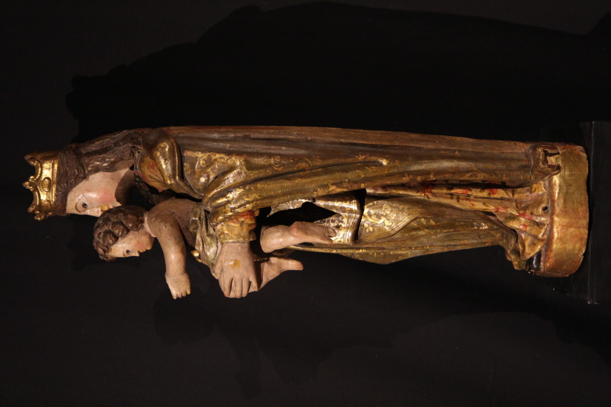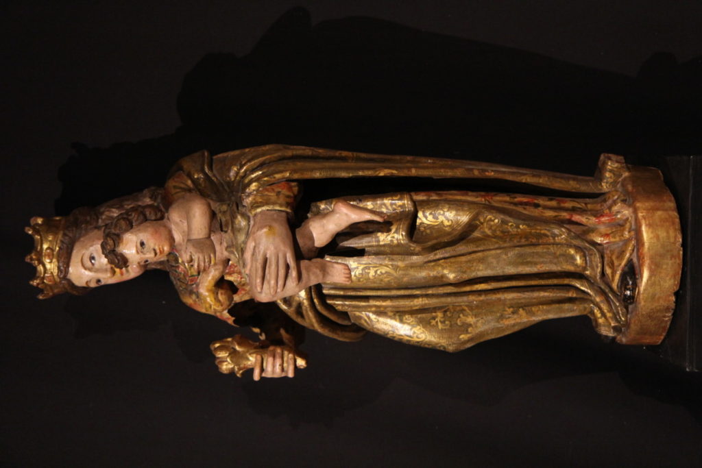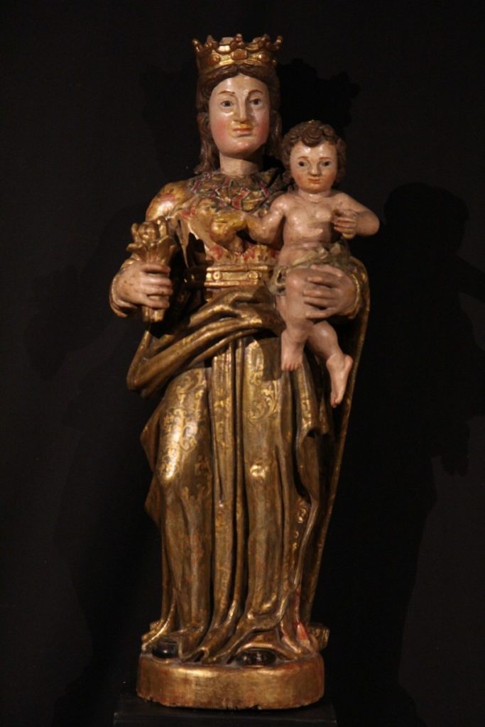 Vierge à l’Enfant. Statue en bois de noyer sculpté, doré et polychrome. La Vierge couronnée tient un bouquet de fleurs d’une main et, de l’autre porte l’Enfant. Le riche décor de la robe et du manteau traité en sgraffito et l’expression solennelle des visages sont typiques d’un travail espagnol (Castille ?). Epoque XVII°.