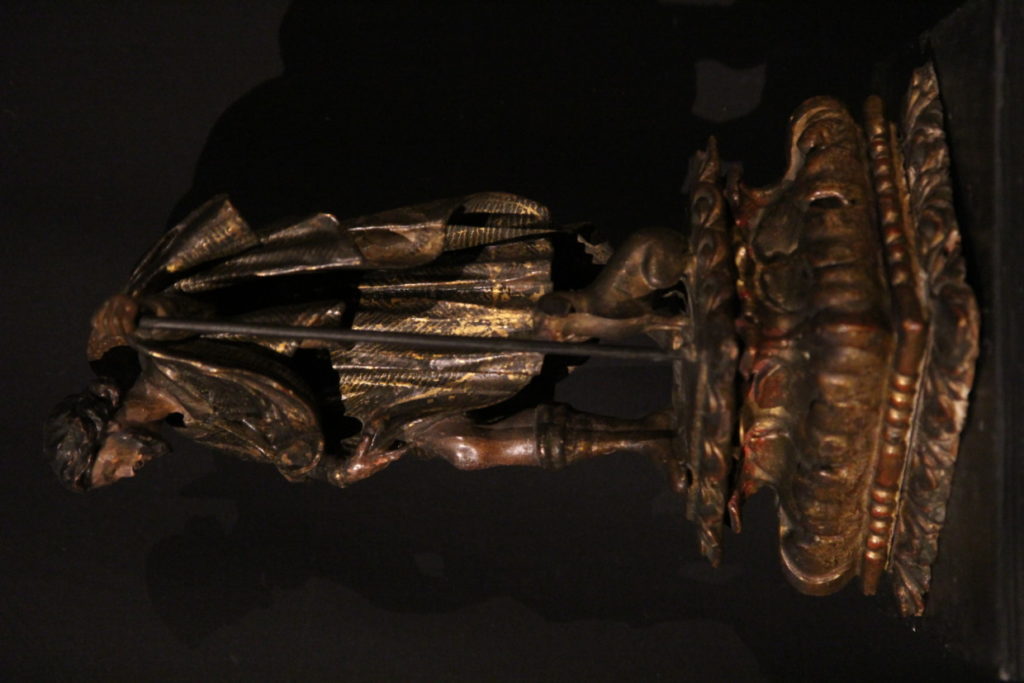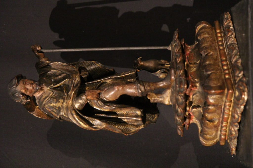 St Georges et le dragon. Importante statue en bois sculpté. Le saint, vêtu à l’antique, piétine le dragon et le tient enchainé. Rare représentation où le saint apprivoise et maitrise le mal.