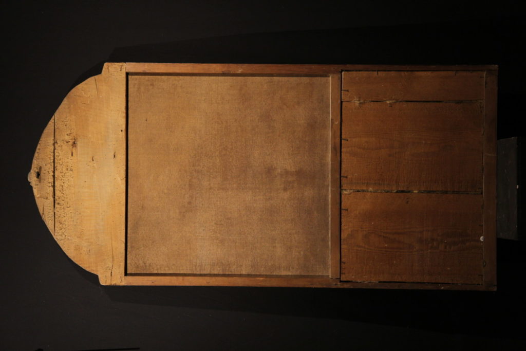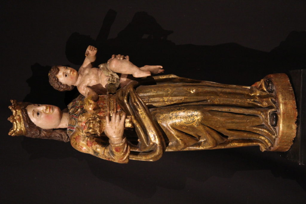Vierge à l’Enfant. Statue en bois de noyer sculpté, doré et polychrome. La Vierge couronnée tient un bouquet de fleurs d’une main et, de l’autre porte l’Enfant. Le riche décor de la robe et du manteau traité en sgraffito et l’expression solennelle des visages sont typiques d’un travail espagnol (Castille ?). Epoque XVII°.