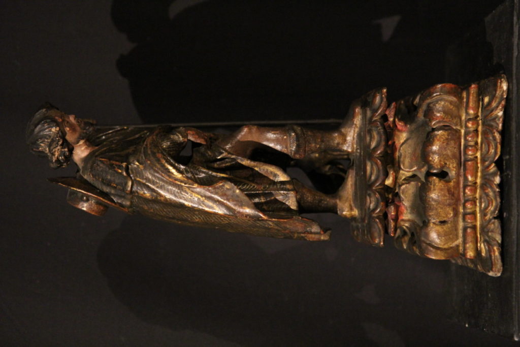 St Georges et le dragon. Importante statue en bois sculpté. Le saint, vêtu à l’antique, piétine le dragon et le tient enchainé. Rare représentation où le saint apprivoise et maitrise le mal.