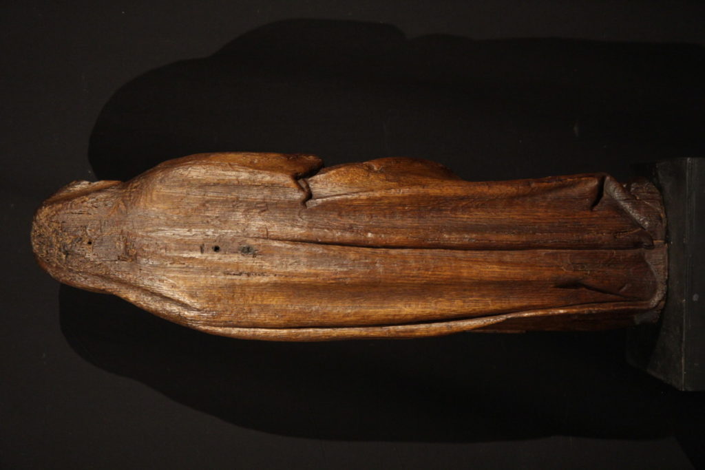 Statue de sainte jeune femme à la couronne de fleurs. Espagne époque XVII°. Sculptée en bois de chêne avec sa polychromie d’époque et richement vêtue à l’antique, elle porte un collier supportant un cœur. La main droite tenait probablement la palme du martyre.